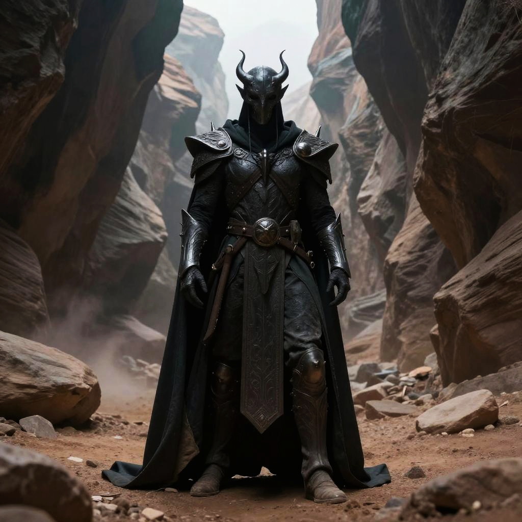 A photograph of a dark, armored warrior standing in a rocky, cavernous landscape. The figure, facing forward, wears a black helmet with a hood obscuring their face, and intricate, spiked shoulder armor. Their dark, leather-like cloak extends to mid-thigh, adorned with a large, ornate belt buckle. The ground is covered in small rocks and dirt, with tall, shadowy rock formations framing the background. Light filters through the cavern's opening, illuminating the warrior's silhouette. The overall scene has a moody, epic fantasy feel, with a contrast between the dark armor and the lighter rocky surroundings.
