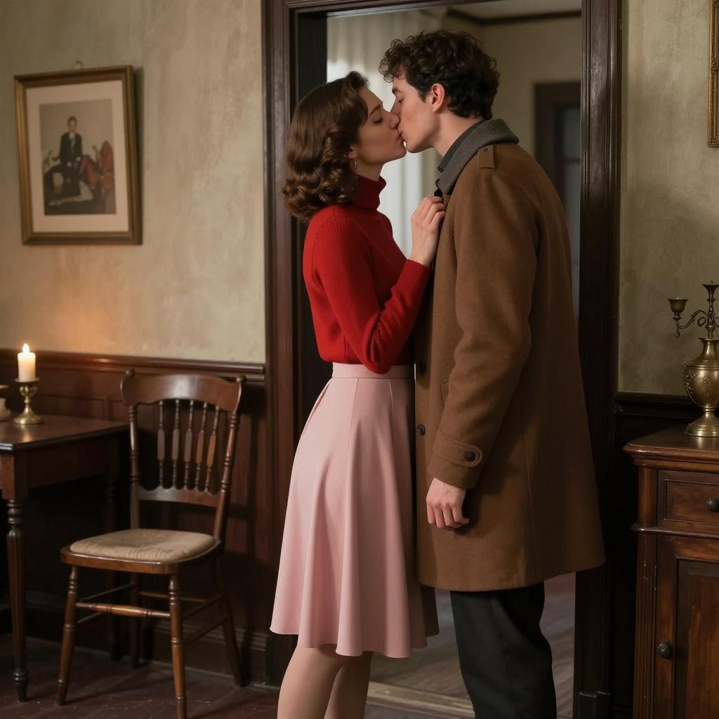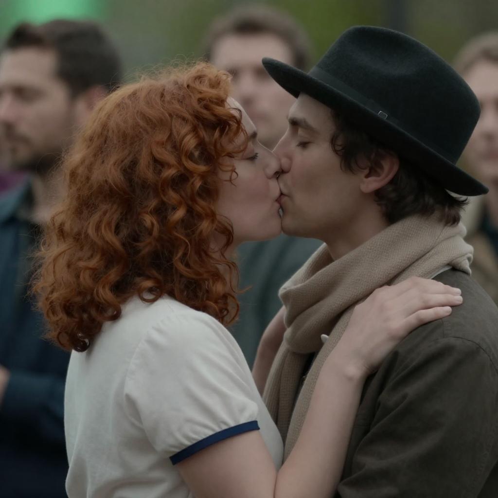 A photograph of a dark, intimate moment. A man in a beige suit and flat cap embraces a woman with red curly hair in a blue shirt and white dress. The woman leans back into him, her dress blowing. Dim, industrial background with beams and shadows. The man's eyes are closed, focused on the woman.