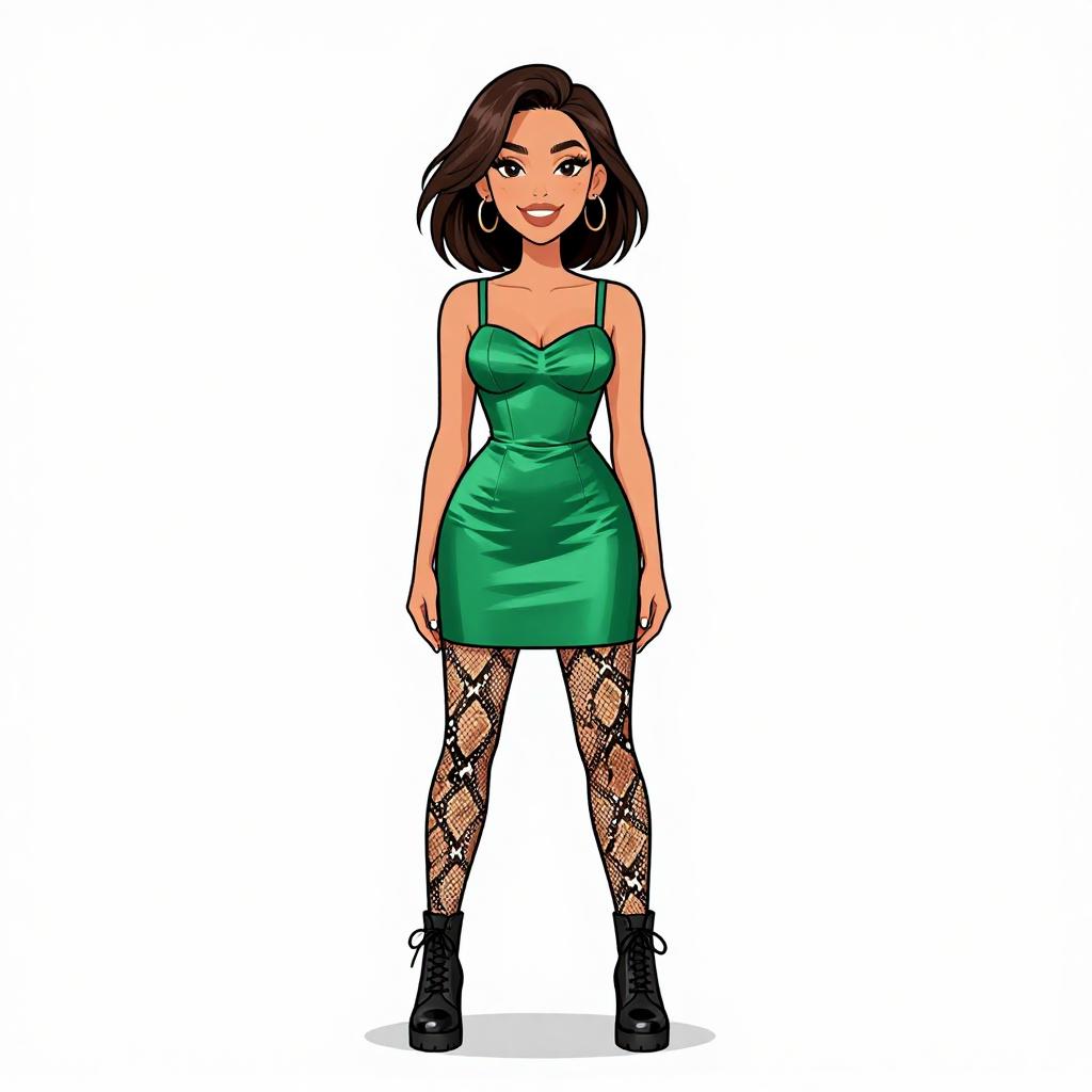 This digital illustration features a young woman standing against a white background. She has light skin, shoulder-length dark brown hair, and is smiling with red lipstick. She wears a form-fitting, strapless green dress that highlights her slender figure and medium-sized breasts. Her legs are covered in black, intricate fishnet stockings, and she wears black high-heeled shoes. Large hoop earrings adorn her ears. The illustration uses bright, bold colors and clean lines, with a slightly cartoonish style. The woman's confident stance and vibrant outfit convey a sense of style and poise.