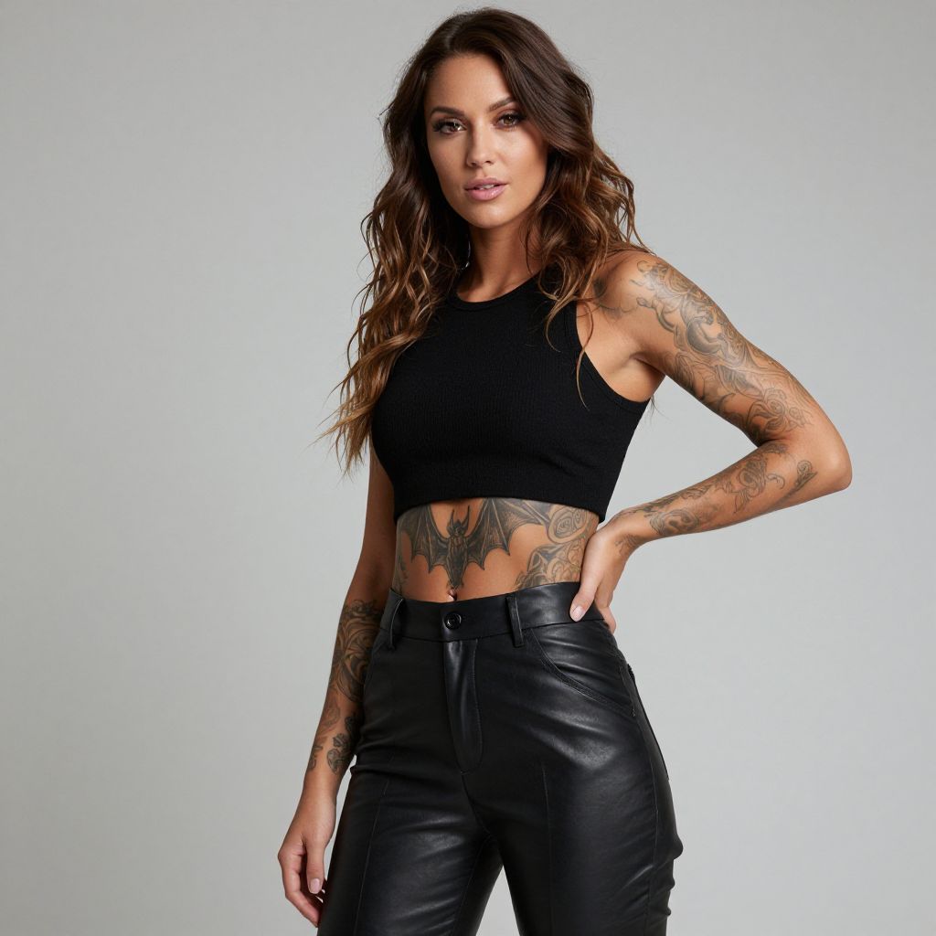Photograph of a tattooed woman with long, wavy brown hair, wearing a black sleeveless crop top and high-waisted black leather pants. Her arms and torso are covered in intricate black and grey tattoos, including a prominent bat design on her stomach. She's standing against a plain grey background, with her right hand resting on her hip. The lighting is bright and even.
