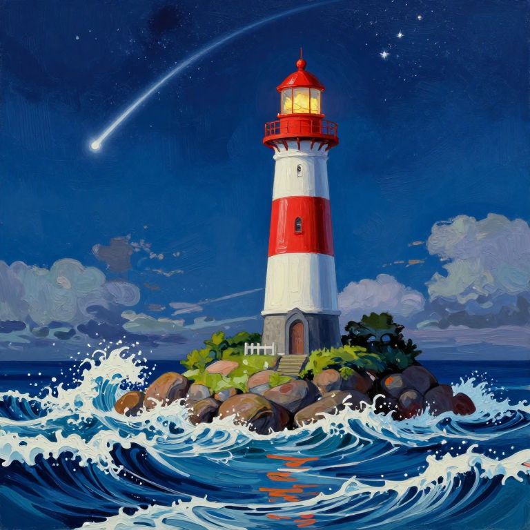Impasto oil painting, Vibrant and dynamic illustrations and vectors, a picturesque 1lighthouse standing tall on a small island, detailed waves crashing on the shore, night, starry sky, shooting star, vibrant colors, dynamic composition, digital painting, Studio Ghibli-inspired, cozy lighting, whimsical atmosphere, by Junji Ito and Hayao Miyazaki, artstation trending, 4k resolution