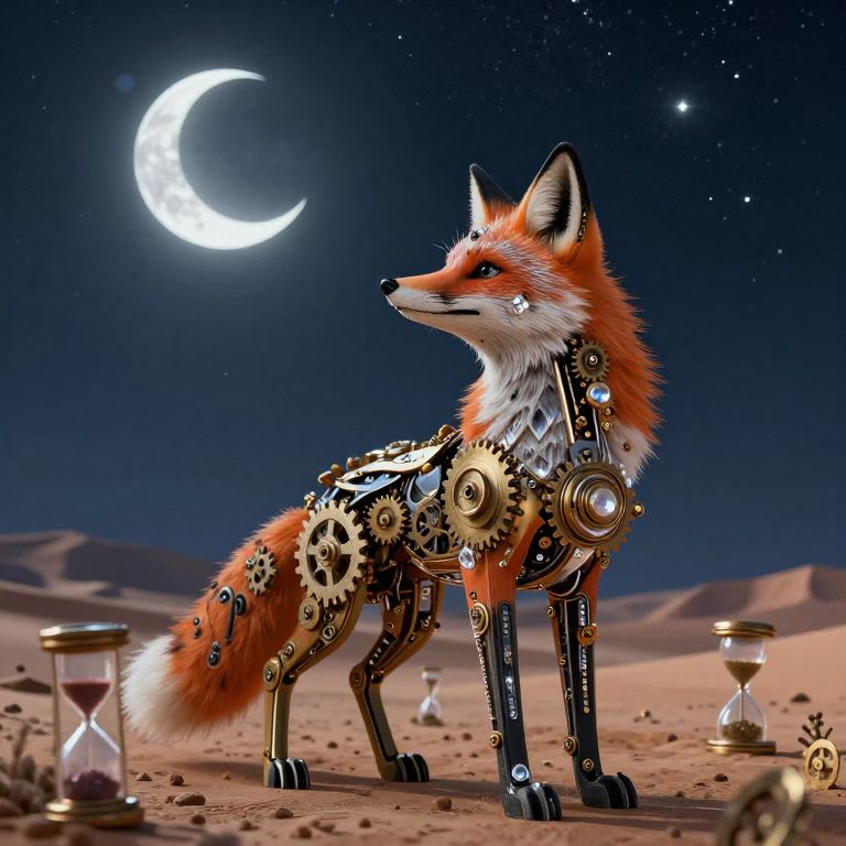 In a surreal, steampunk-inspired digital artwork, a clockwork fox adorned with intricate gears and shimmering crystal accents stands poised against a starry night sky, its body seamlessly integrated with mechanical components as it gazes toward a luminous crescent moon, surrounded by a desert landscape dotted with tumbling hourglasses.