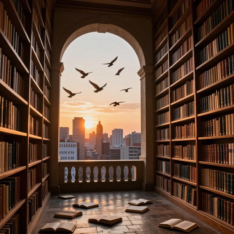 Sunlit archway connects a dimly lit library filled with towering wooden shelves of books to a vibrant cityscape at sunset, where seven birds soar through the sky above scattered open books on the stone floor below.