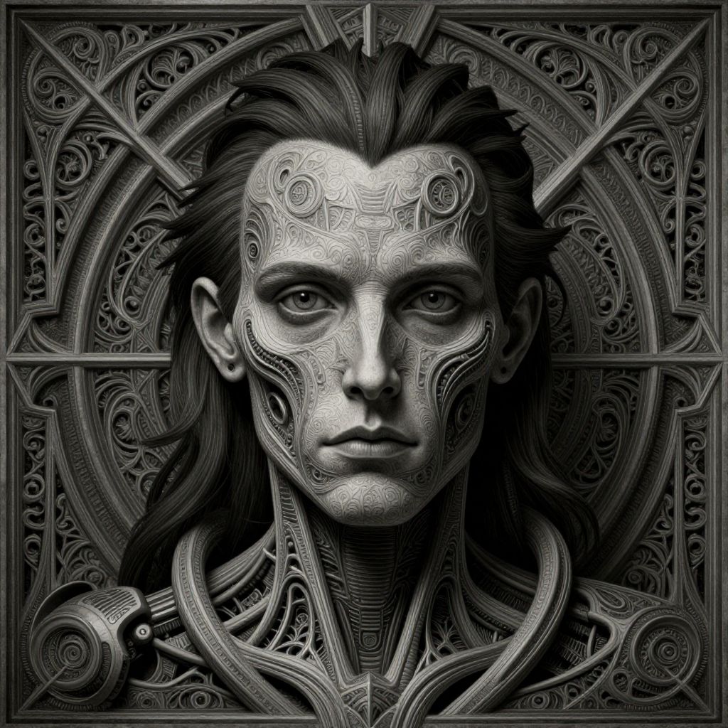 The image presents a highly detailed and intricate portrait of a man, reminiscent of the works of M.C. Escher and H.R. Giger. The figure is depicted in a hyperrealistic style, with a focus on anatomical and mechanical elements. The man's face is adorned with elaborate carvings and patterns, blending organic and mechanical textures. His hair is styled in a distinctive manner, adding to the overall complexity of the image. The background features ornate, symmetrical designs that extend into the foreground, creating a sense of depth and dimension. The color palette is monochromatic, with shades of gray and black dominating the scene, emphasizing the intricate details and the interplay between light and shadow. The overall composition is balanced, with the figure centrally positioned and surrounded by the intricate patterns, giving the image a sense of harmony and complexity.