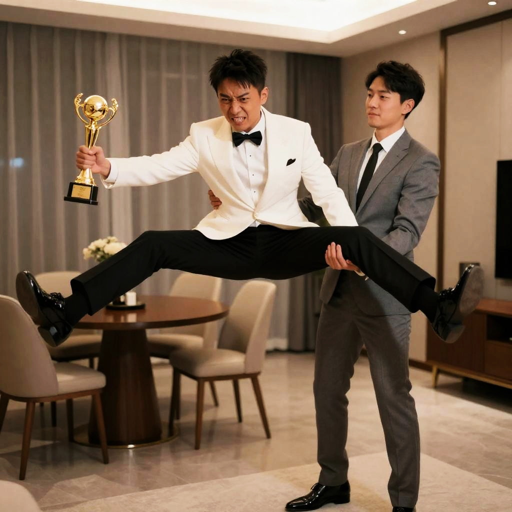 Photograph of two men in a living room. Asian man in white tuxedo and black bow tie, mid-air with legs spread, held by white man in grey suit. Gold trophy in right hand. Brown curtains, round wooden table, chairs, and cabinet in background. Asian man's expression intense, white man's neutral.