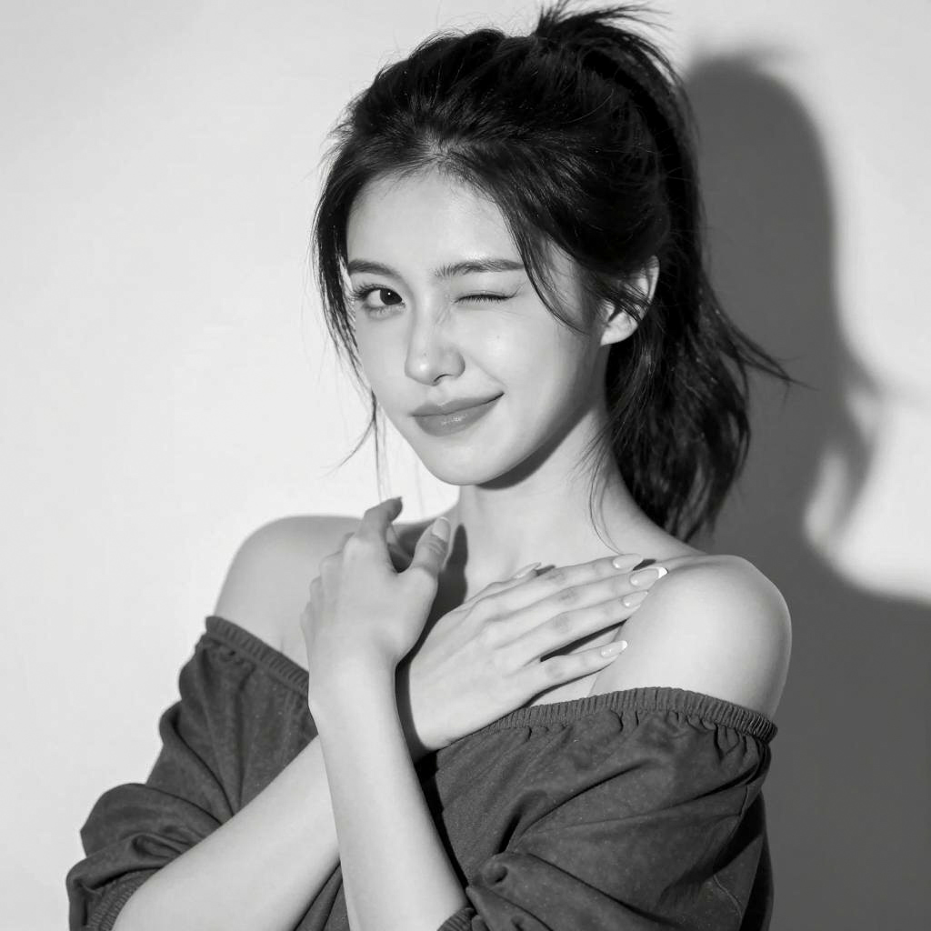 Black and white close-up portrait of a young woman with light skin and dark hair styled in a messy ponytail. She is winking with lips slightly parted, wearing a dark off-shoulder top. Her hands rest gently on her shoulder, showing long manicured nails. A soft shadow is cast on the plain background.