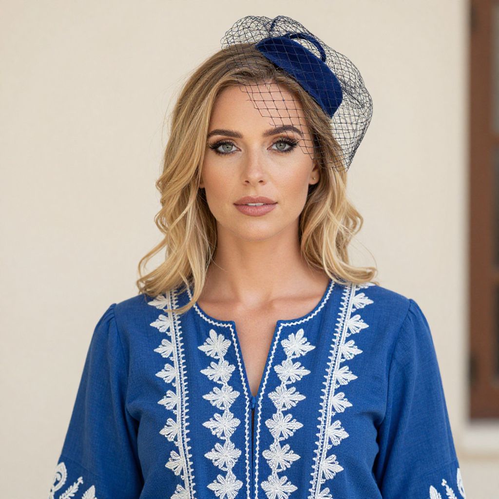 Woman with long blonde hair wearing a blue dress with intricate designs and a scarf around her neck.