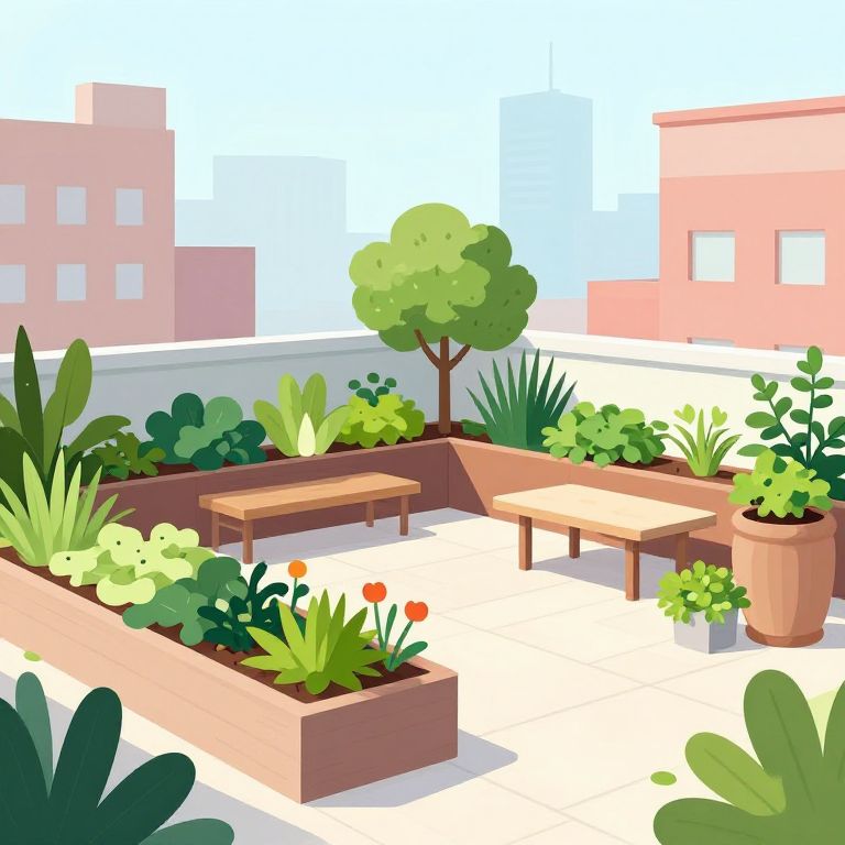 This digital illustration in a bright, cartoonish style depicts a rooftop garden. The layout features rectangular wooden planters filled with various green plants, including leafy greens, small bushes, and flowering plants with orange blooms. Two simple wooden benches are positioned in the center, facing each other. A tall, round tree and a large terracotta pot with more plants are also present. The background shows simplified pink and beige building facades under a clear blue sky. The image uses bold colors and clean lines, creating a cheerful, inviting atmosphere.
