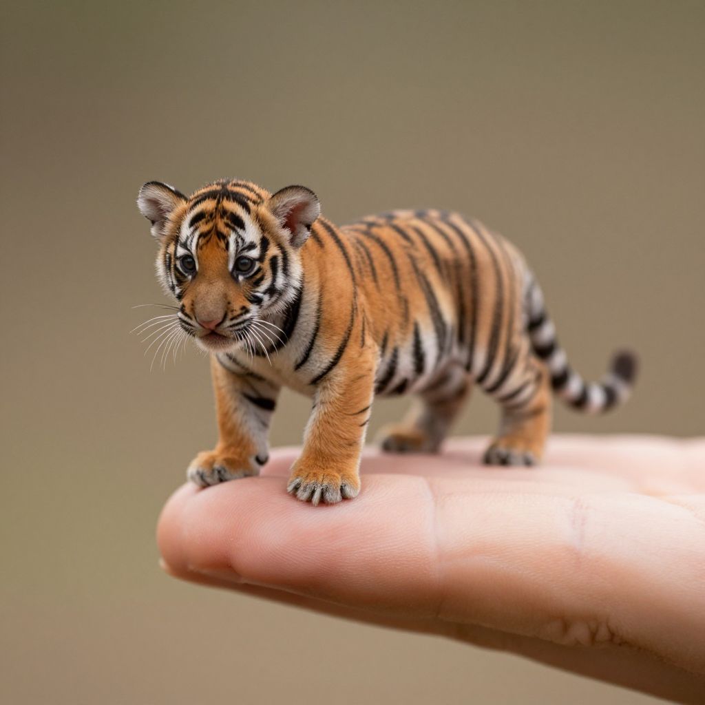 National Geographic-style macro photograph of a tiny tiger cub standing on a human fingertip, The tiger has natural orange and black stripes, with soft, realistic lighting that avoids any overly bright or artificial look, The skin texture of the fingertip is detailed and authentic, with a softly blurred background that enhances the focus on the tiny tiger, The overall image should convey a sense of wonder and realism, capturing the delicate and natural beauty of the scene