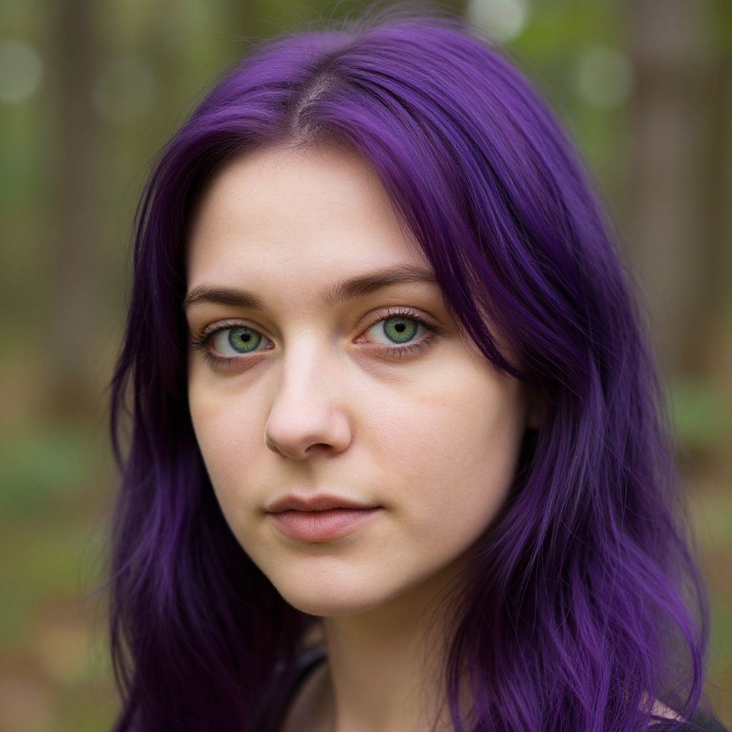 A portrait of a young woman with vibrant purple hair and striking green eyes, illuminated by soft natural light, set against a blurred forest background, showcasing delicate facial features with a serene expression in a realistic style.