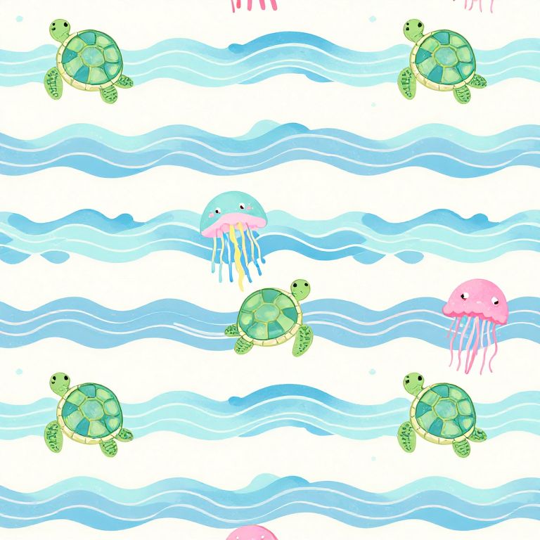 A digital drawing in a cartoon style features a repeating pattern of green sea turtles and jellyfish set against wavy blue ocean lines. The turtles, with detailed green and yellow shell patterns and flippers, are scattered above and below the wavy lines. The jellyfish, with pink bell shapes and blue tentacles, are interspersed among the turtles. The background is white, emphasizing the bright colors of the sea creatures and ocean waves. The overall composition is playful and whimsical, suitable for children's wallpaper or fabric designs.