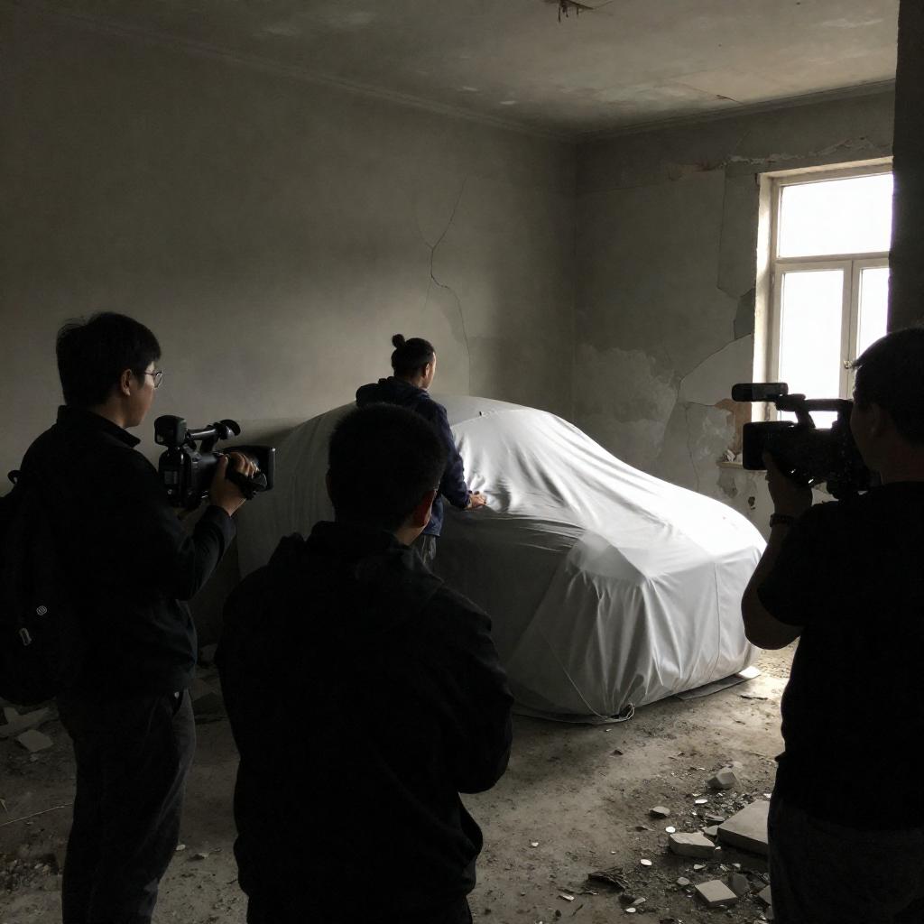 Photograph of a dimly lit, ruined building. A man with a ponytail, wearing a dark jacket, stands near a large, white, covered object. Two cameramen in the foreground film with a large camera. Cracked walls and debris surround the scene. Bright light from a window on the right illuminates the white object.