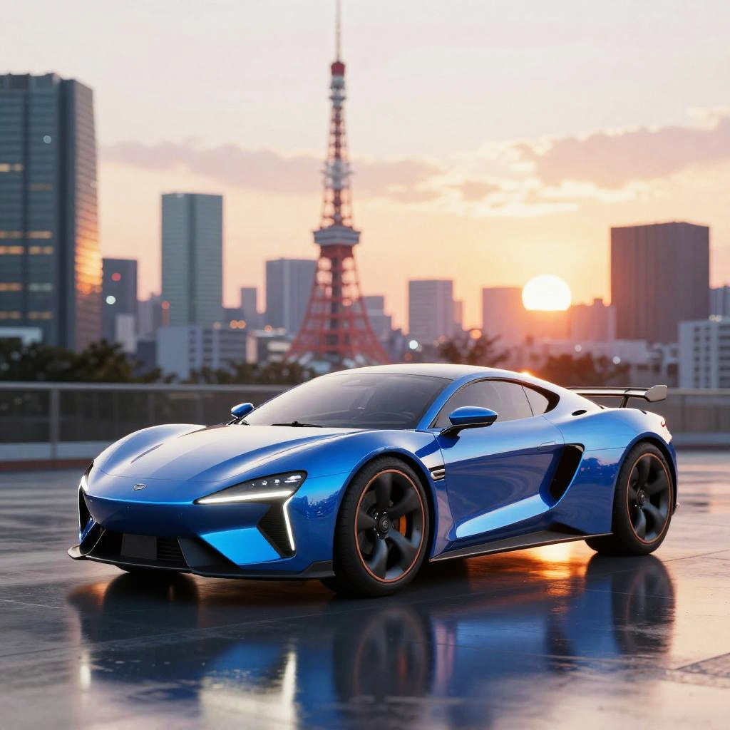 Digital artwork of a futuristic, aerodynamic sports car speeding through a dark environment illuminated by blue and black tones. The car features bright white LED headlights and a stylish design with smooth curves. Blue light streaks trail behind, emphasizing motion and speed in a cyberpunk-inspired setting.