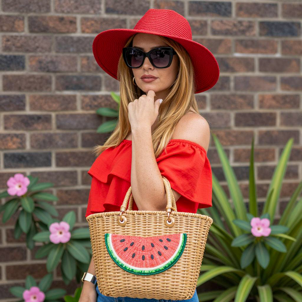 Woman with long blonde hair, wearing large black sunglasses, orange off-the-shoulder dress, and red straw hat. Holding wicker handbag with red and black pattern, and pointing with right index finger. Brick wall background. Flowers in foreground. Blurred window in background.