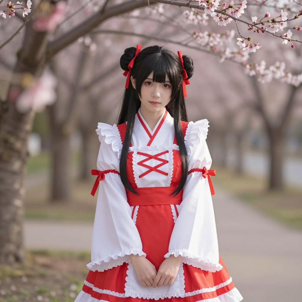 Tohsaka rin cosplay, photorealistic anime-style girl, standing in a park with cherry blossom trees, wearing a red and white traditional Japanese dress with puffed sleeves and lace-up bodice, red ribbons in hair, long black hair in twin buns, red cherry blossoms in foreground, soft sunlight, gentle focus, spring background, girl looking straight ahead, hands clasped in front, detailed ures, vibrant colors, model wearing dress with ruffled white trim, forest path in background, warm and inviting atmosphere