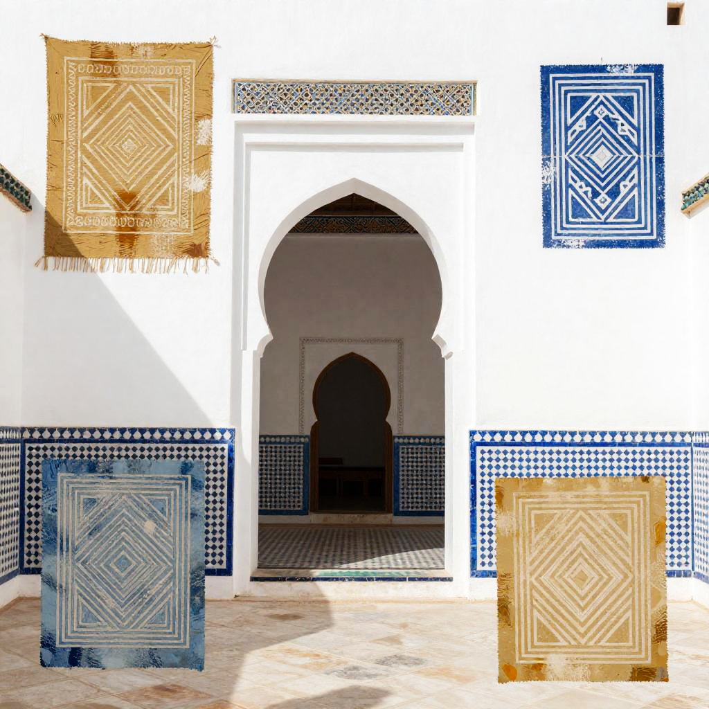 Explore Moroccan riad interiors and courtyards through an innovative blend of textile-inspired geometric linocut with mixed-media layering elements. Utilize a muted color scheme set against a bright white backdrop to create a minimalist aesthetic. Integrate muted saffron and faded indigo accents through mixed media artistry, emphasizing painterly effects.