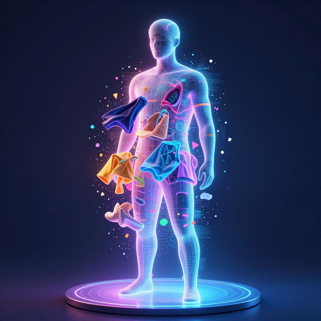 Concept art of AI clothing remover software, showing a holographic human figure with layers of clothes fading away into pixels, sleek cyberpunk aesthetic, dark background with vibrant neon highlights, detailed intricate digital effects, sci-fi atmosphere.