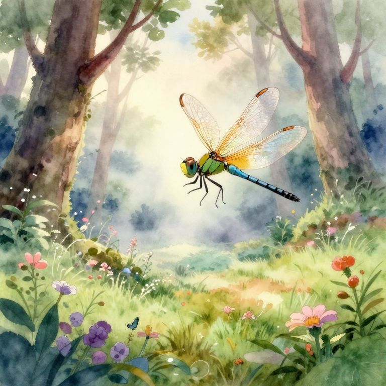 This digital illustration depicts a luminous night scene in a Japanese garden. A glowing blue dragonfly with translucent wings hovers above a serene, reflective pond, surrounded by pink cherry blossom trees. The sky is a deep navy blue, dotted with twinkling lights. In the background, traditional Japanese wooden structures are partially visible. The ground is adorned with rocks and greenery, while the water reflects the cherry blossoms and dragonfly. The overall style is vivid and magical, blending realism with fantasy elements.