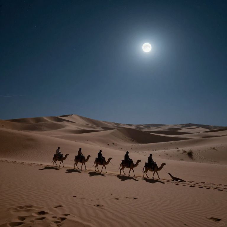 In the quiet embrace of a starlit desert, a caravan of riders traverses ancient sands atop majestic lizards, their journey a tapestry of solitude and wonder, where the whispers of eternity echo softly beneath the moon's watchful gaze.