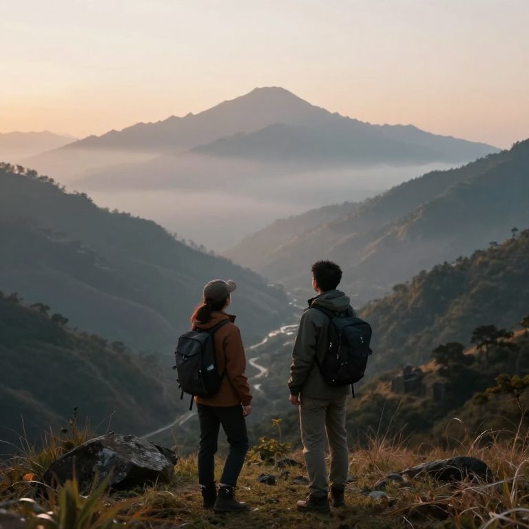 Two friends hiking in a mountain valley during sunrise, wearing outdoor gear, one pointing at a distant peak, peaceful atmosphere, misty hills, nature-focused, soft morning light, AI-generated landscape with emotional warmth.