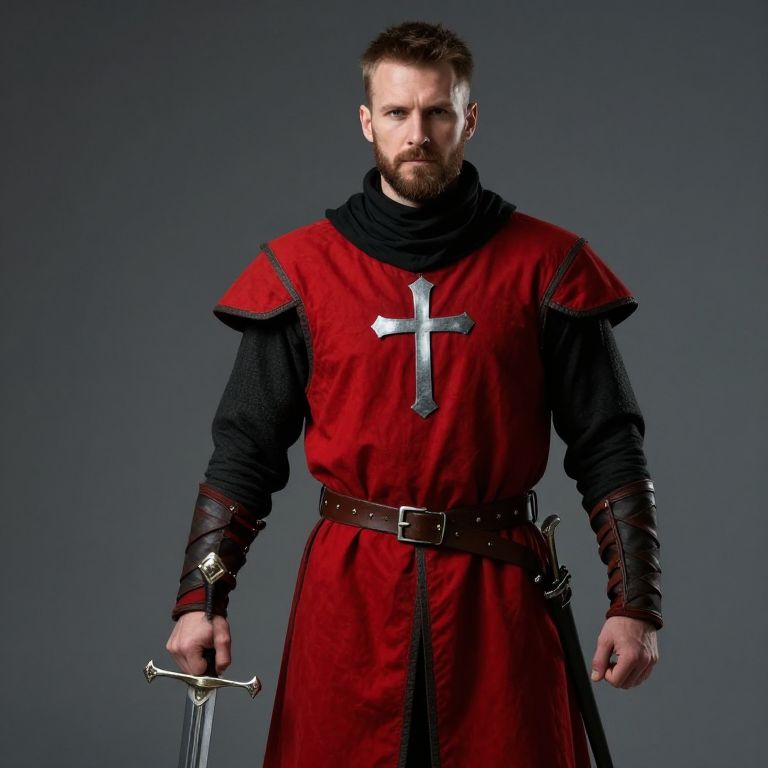 Male wearing a red and black medieval outfit with a cross on the chest and a black scarf around his neck. He is holding a sword in his right hand and has a beard.
