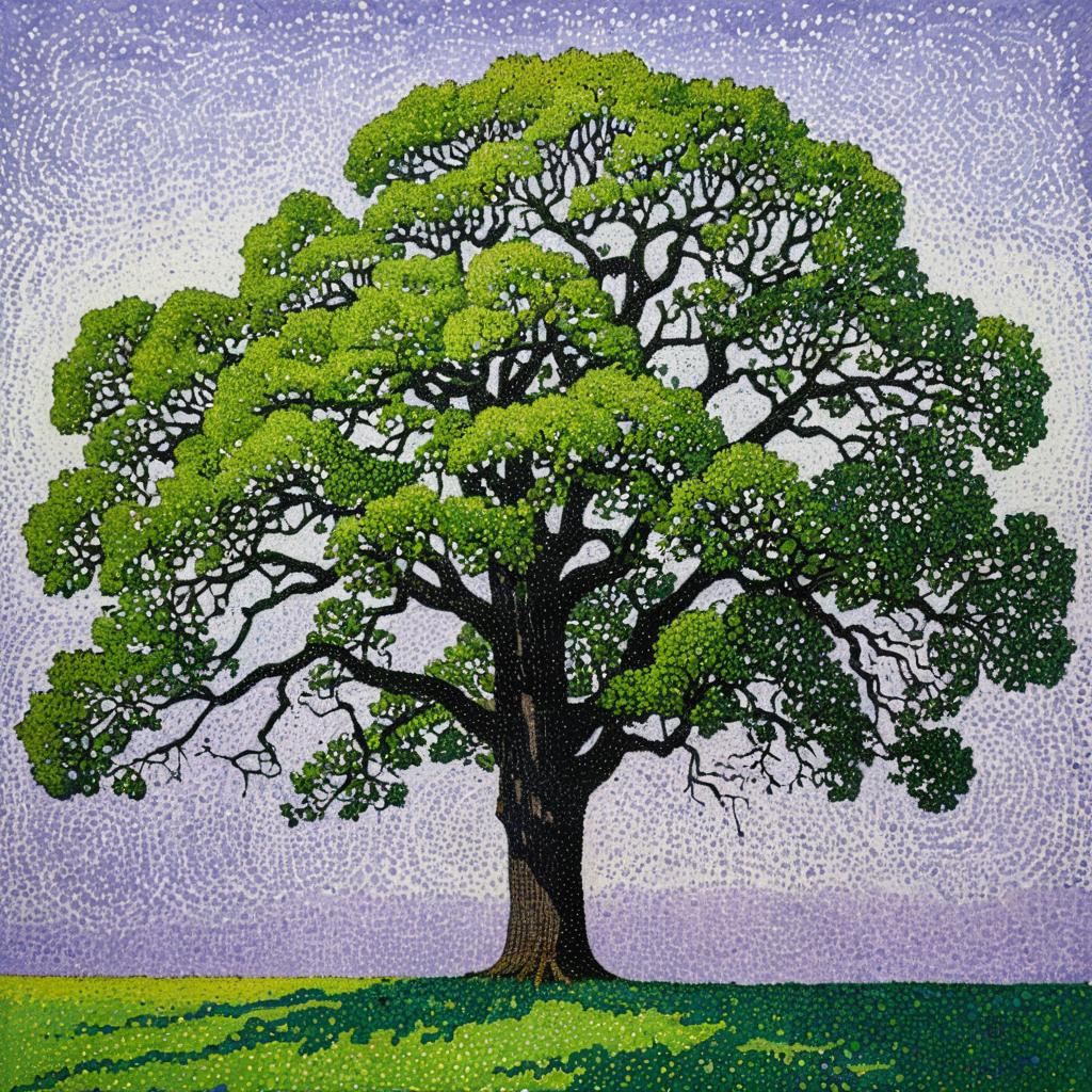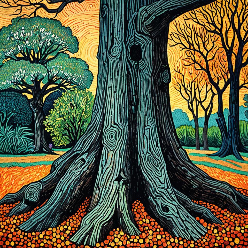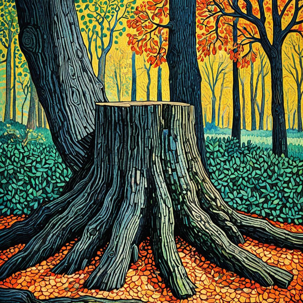 A hyper-detailed Neo-Impressionist drawing of an ancient tree stump, in the style of Paul Signac, Henri Rousseau, Maurice Denis, with vibrant stylized patterns and magical fiery details