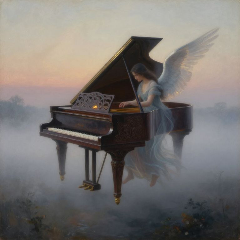 Dreamy painting of an angelic woman with wings playing a grand piano in a misty, twilight landscape. Ethereal, serene atmosphere.