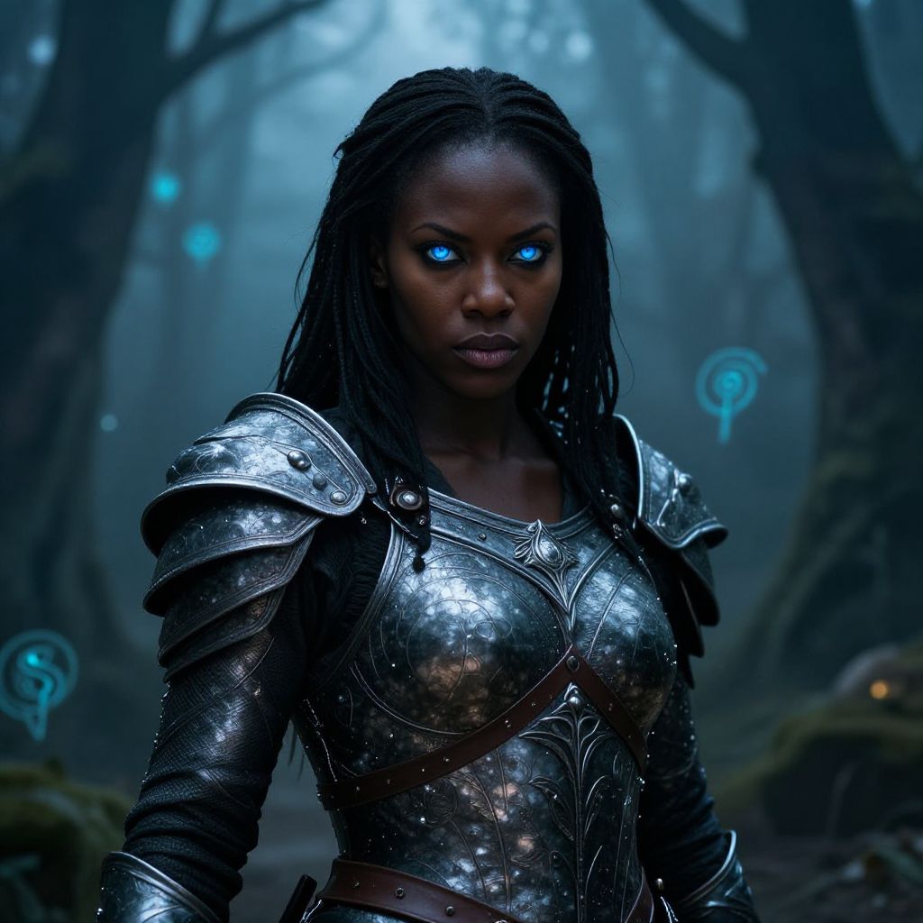 Dark-skinned woman with glowing blue eyes, wearing shiny silver armor, standing in a mystical, foggy forest with glowing blue orbs. Digital art.