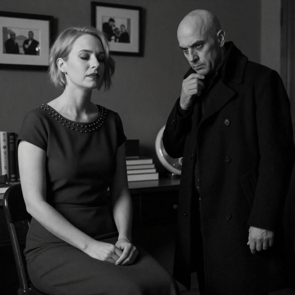 Black and white photograph featuring a seated woman with short light-colored hair wearing a dark studded dress, eyes closed, and a standing bald man wearing a dark overcoat with an intense expression. The background shows framed photos, stacked books, and a round decorative object, suggesting a contemplative or serious atmosphere.