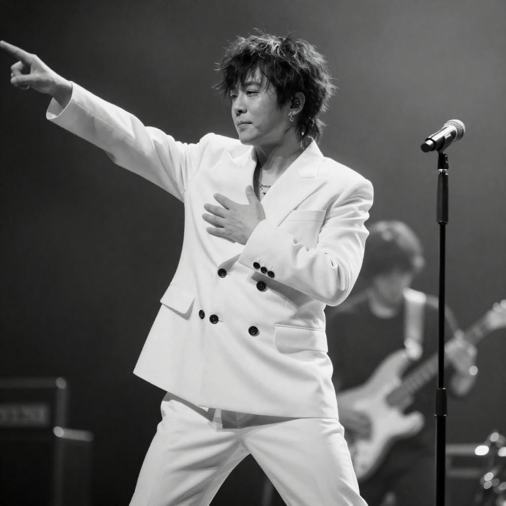 Black-and-white photograph of a male rock musician in mid-performance. He wears a white, double-breasted suit with black buttons, striking a dynamic pose with one arm extended forward and the other across his chest. His dark hair is slightly tousled. A microphone stand is visible to the right, and a blurred guitarist is in the background.