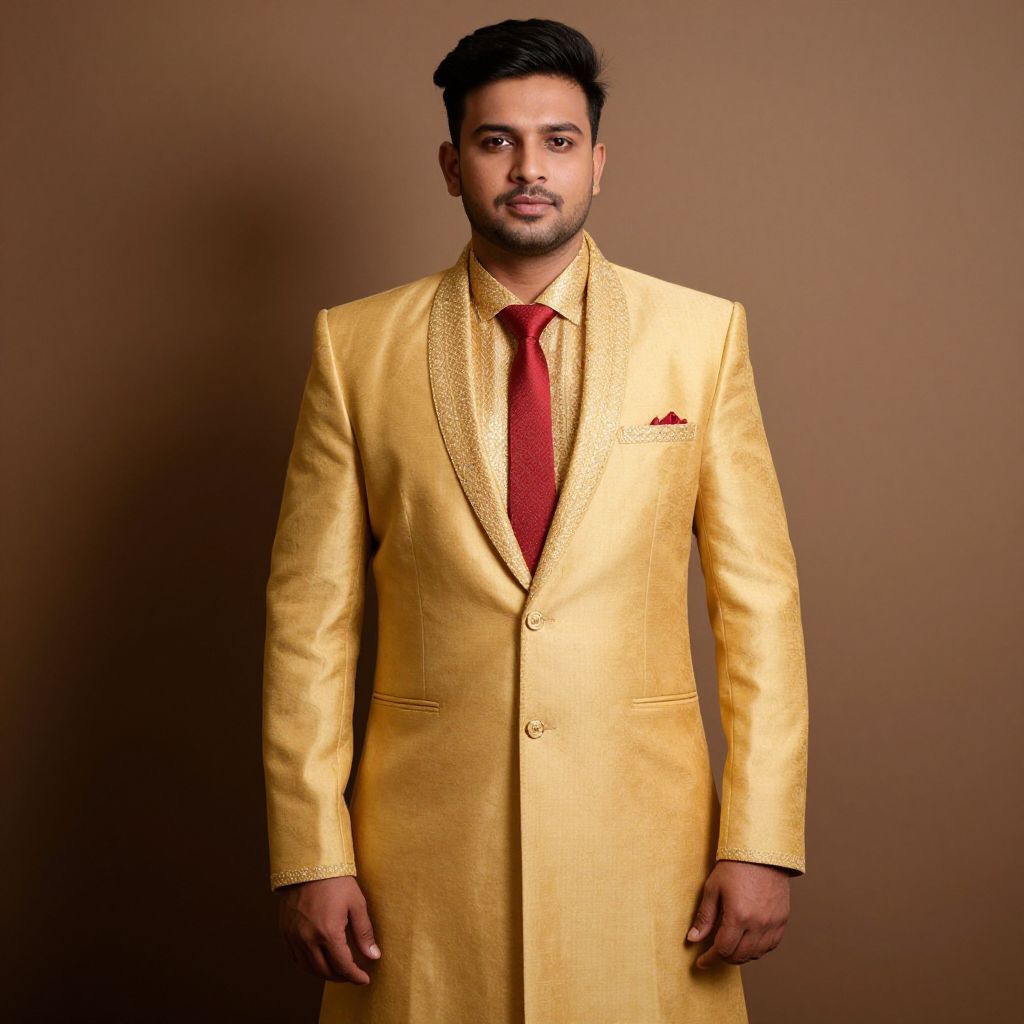 "Sherwani Plus Size Groom, a man in a golden suit and red tie standing in front of a wall"