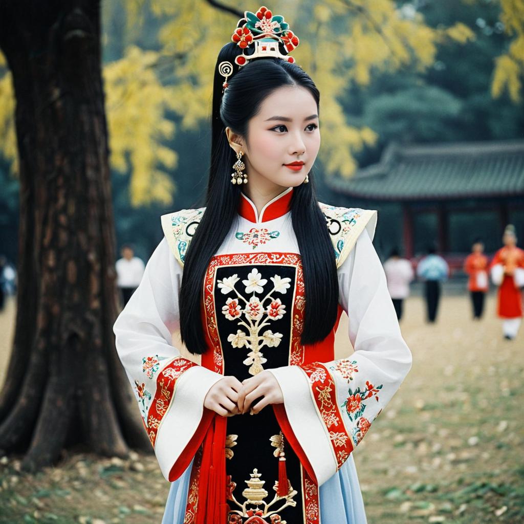 Chinese nutcracker costume ,1girl, solo, jewelry, black hair, earrings, long hair, outdoors, tree, chinese clothes, blurry background, long sleeves, blurry