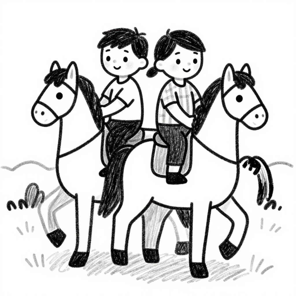 Black and white sketch of two children riding horses side by side, simple cartoon style with bold lines and minimal detail.