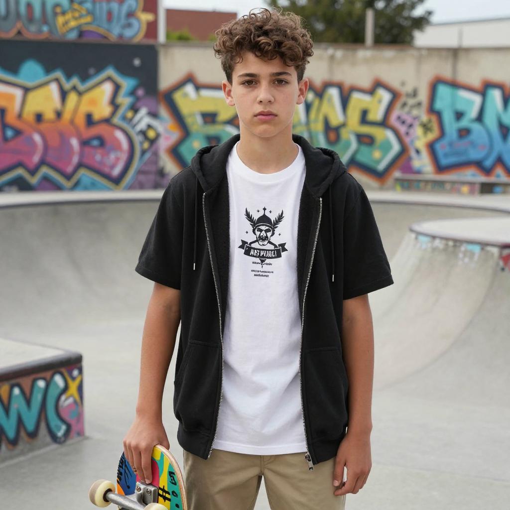Portrait of a determined teenage boy with short curly hair and brown eyes holding a colorful skateboard in an urban skate park. He is wearing a white graphic t-shirt under a black short-sleeve hoodie and khaki pants. The background features vibrant graffiti art, emphasizing street culture and urban fashion.