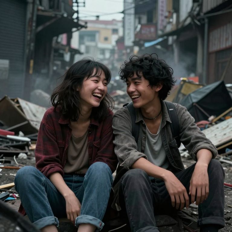 Photograph of laughing Asian couple with messy black hair, wearing casual clothes, sitting amidst rubble in a post-apocalyptic urban alley.