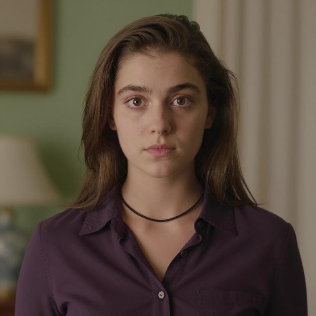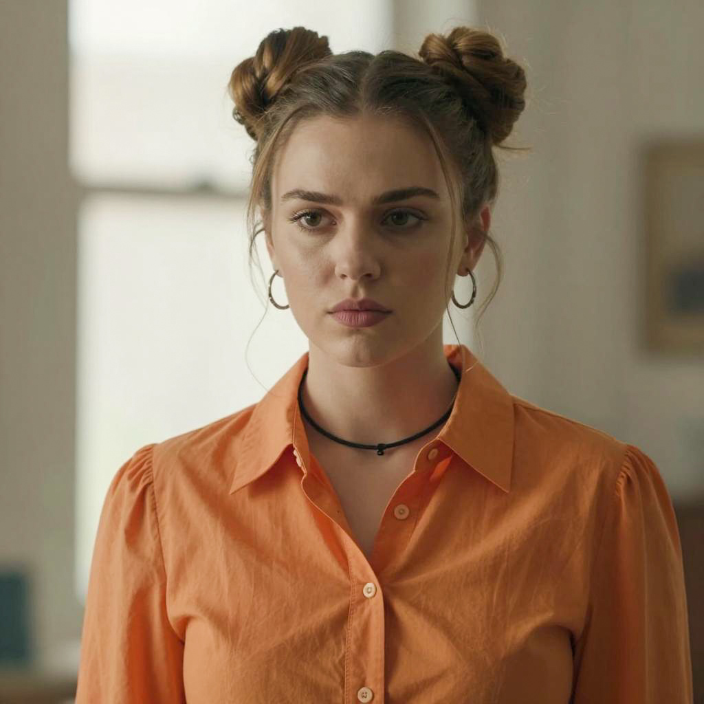 Young woman with light skin, brown hair, white lace dress, wide-eyed expression. Blue, bald, headless man with white face, surprised expression. Dark, blurred background with warm lights. Woman in center, headless man to the left. Foreground has indistinct objects.