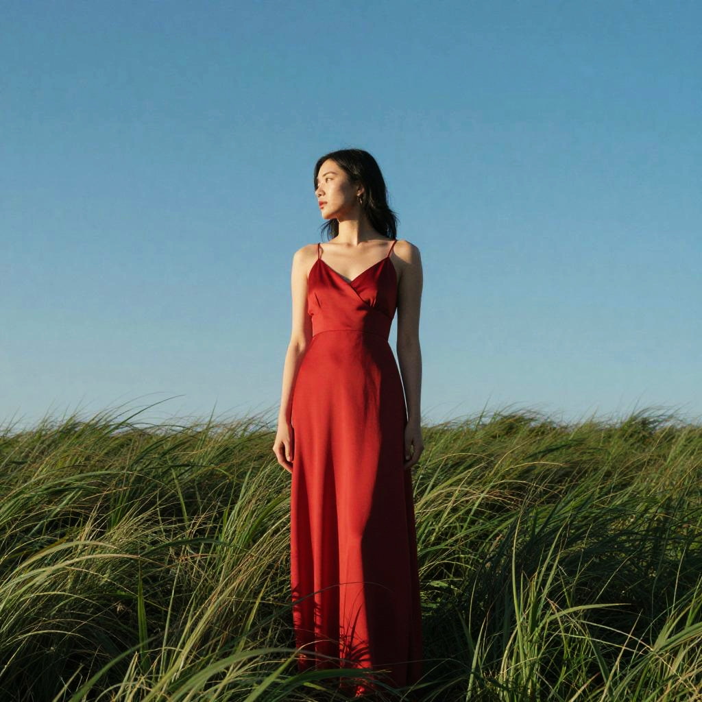 Photograph of a slender woman with fair skin and dark brown, shoulder-length hair standing in tall, green grass under a clear, bright blue sky. She is wearing a flowing, sleeveless, deep red dress with a V-neckline, which contrasts sharply with the green grass and blue sky. She stands in a relaxed pose, looking off to the side with a serene expression. The sunlight casts soft shadows, enhancing the natural textures of the grass and her dress. The overall composition is simple yet striking, emphasizing the vibrant colors and natural beauty of the scene.