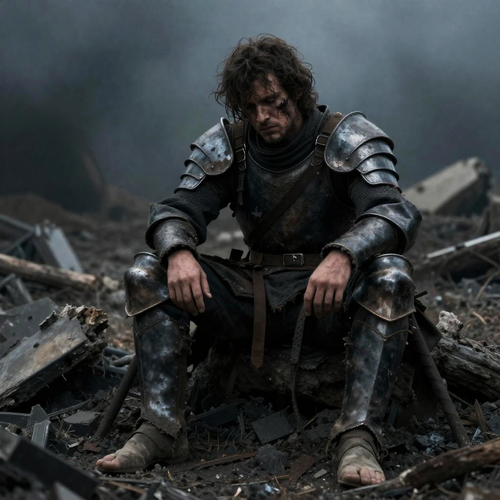Realistic photo.Conceptual Art cinematic still, dark synth, a lone warrior sits among the ashes. He is depressed, wearing tattered armor, his face smeared with grime, unkempt hair, barefoot. Inspired by Susan Meiselas, August Sander, Edward Steichen realistic photo