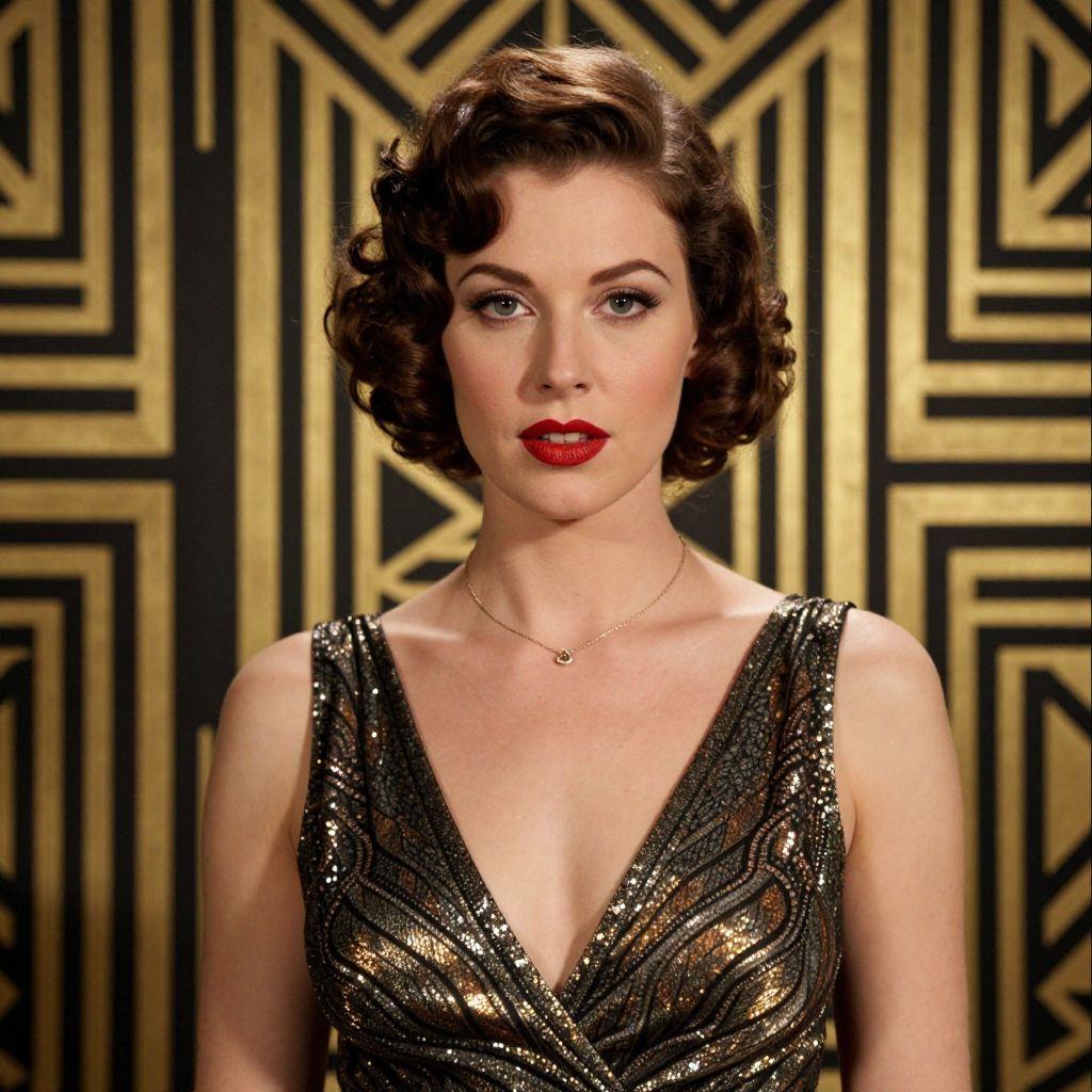 This is a vintage-style photograph of a fair-skinned woman with short, curly brown hair and bold red lipstick. She's wearing a sleeveless, deep V-neck dress with a metallic, patterned design, and a delicate necklace. The background features a bold, geometric pattern in black and gold, reminiscent of Art Deco. The lighting highlights her striking features and the dress's shimmering texture.