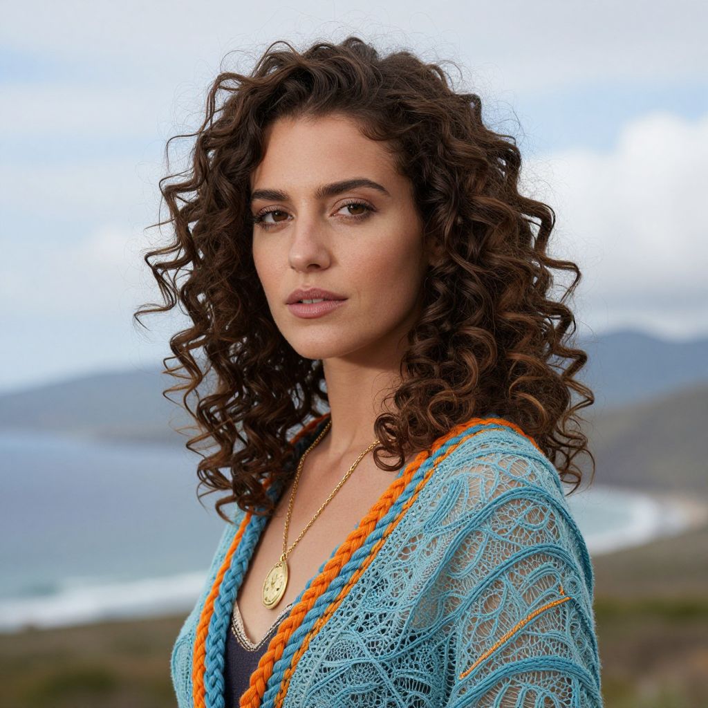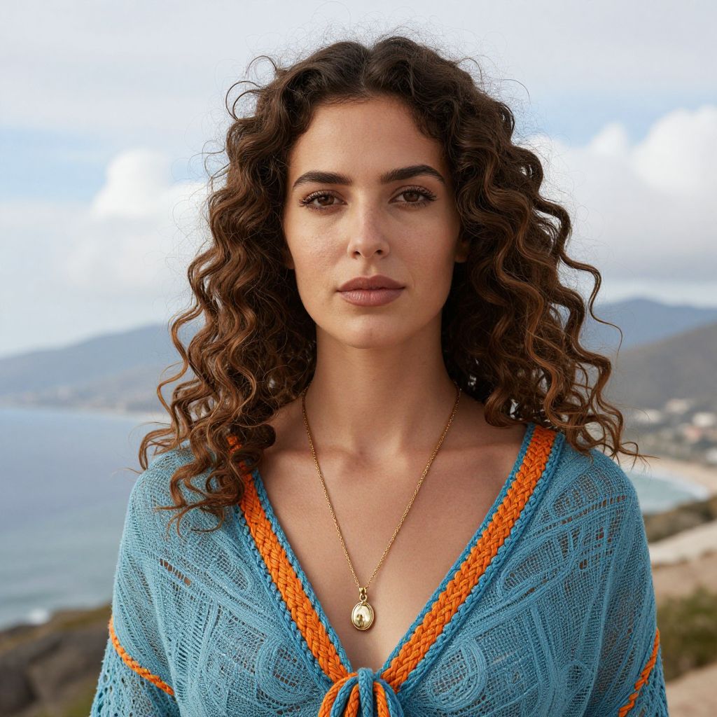 Photograph of a young woman with curly, dark brown hair, olive skin, and brown eyes. She wears a blue, knitted, V-neck top with orange trim and a gold necklace with a circular pendant. The background shows a blurred coastal landscape with a blue sea, mountains, and a cloudy sky. The woman gazes directly at the camera with a neutral expression. Her makeup is subtle, highlighting her natural features. The image has a slight, vibrant, digital enhancement effect, emphasizing the colors and textures.