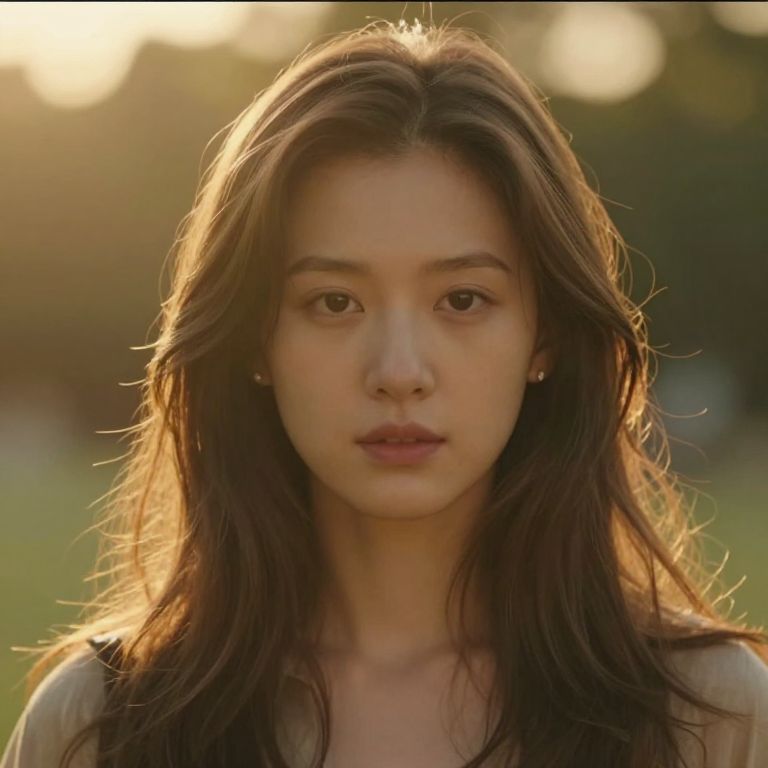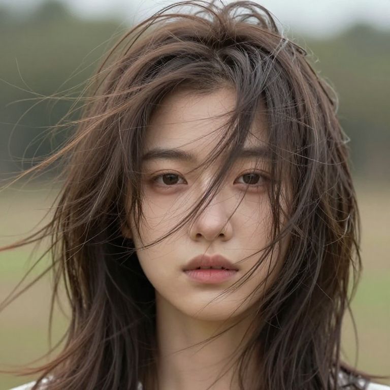 Photograph of an East Asian woman with long, wind-swept dark brown hair partially covering her face. She has fair skin, brown eyes, and slightly parted lips. She wears a dark, patterned top. The background is a blurred, green field with a tree line in the distance, suggesting an outdoor setting. The focus is on her face, with soft, natural lighting highlighting her features. Her expression is neutral, and the overall mood is serene and introspective. The image has a realistic, natural style.