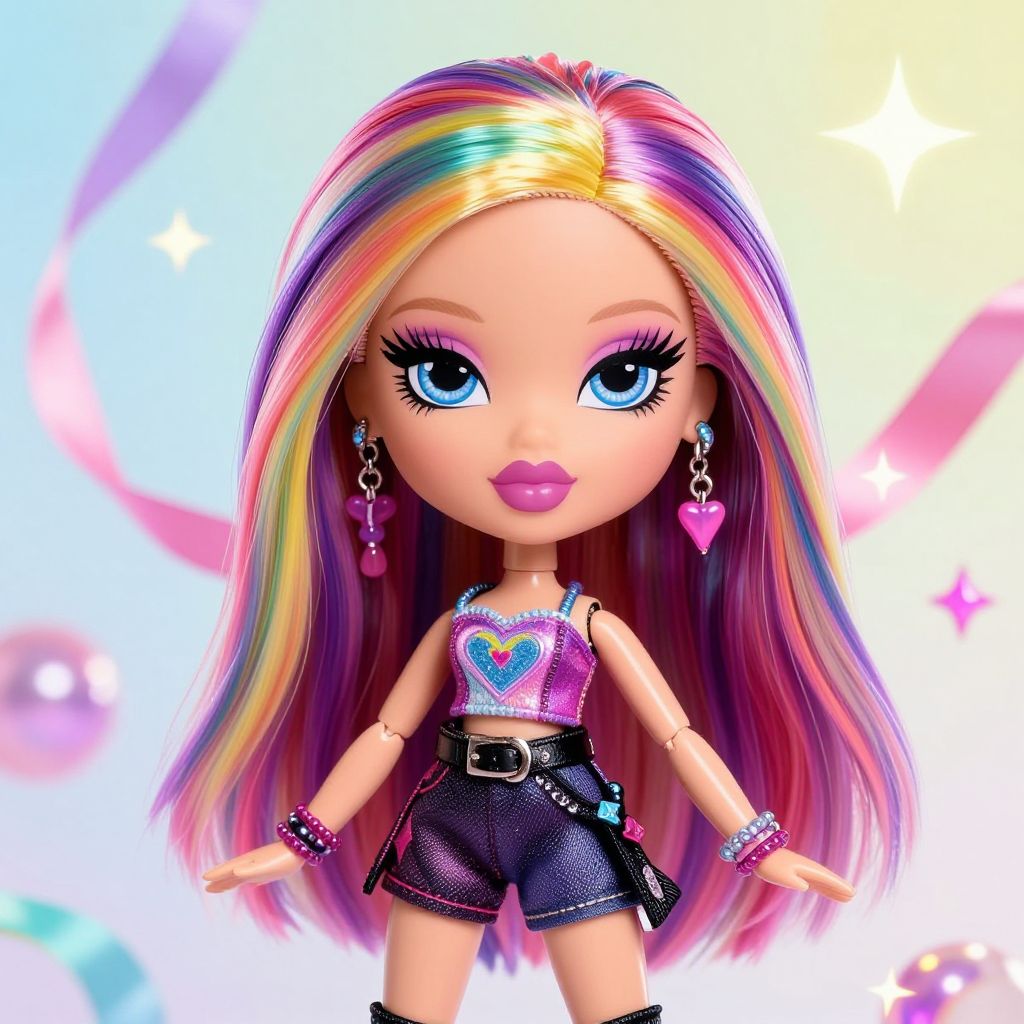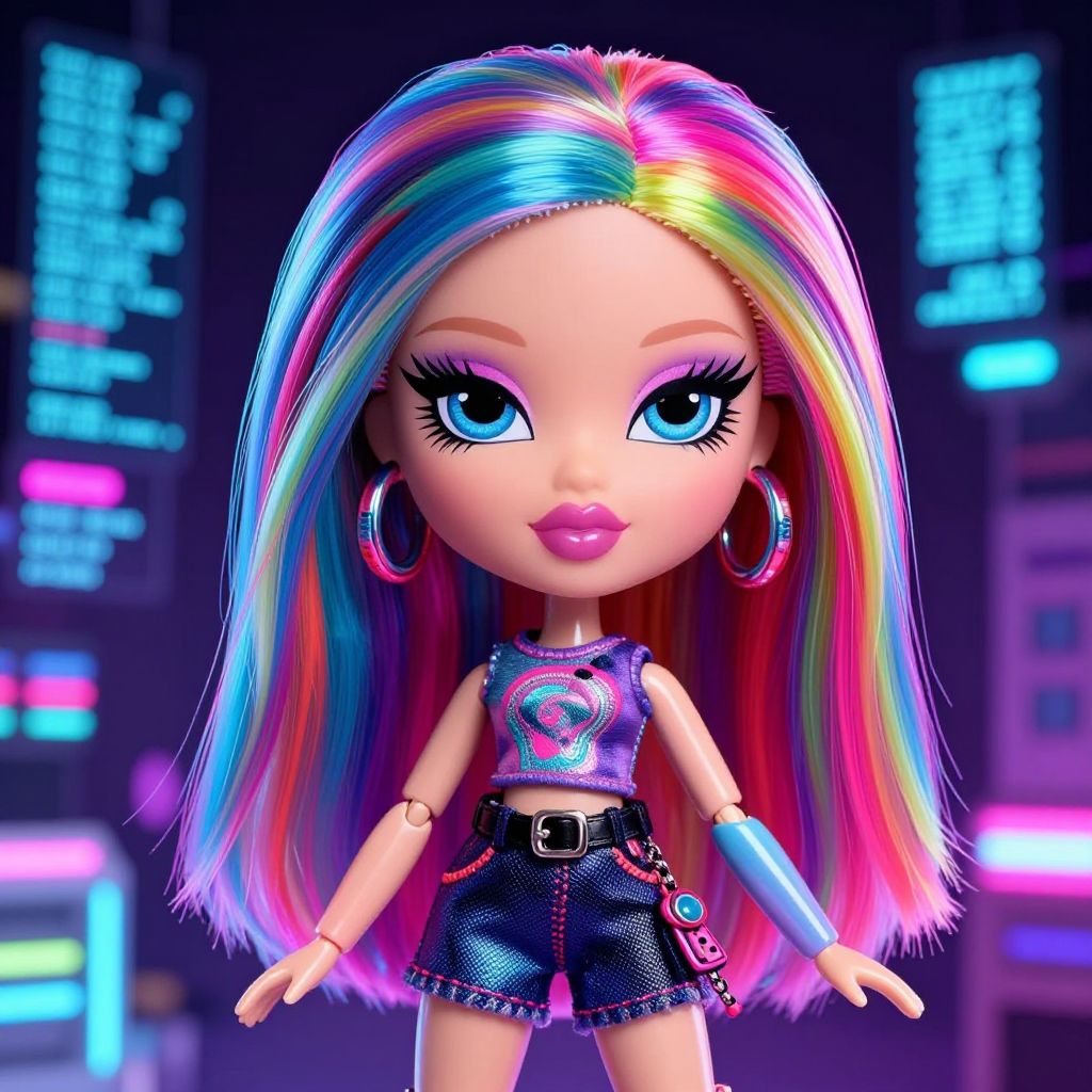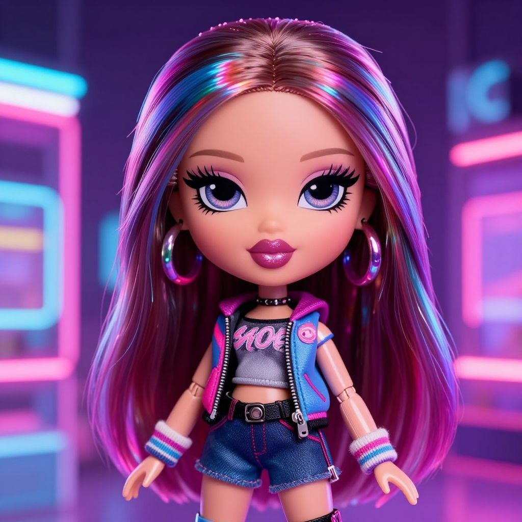 AI Bratz doll generator design featuring a cyberpunk-inspired doll with edgy hair colors, metallic clothing details, and expressive facial features, glowing cityscape background with neon lights, high detail digital painting