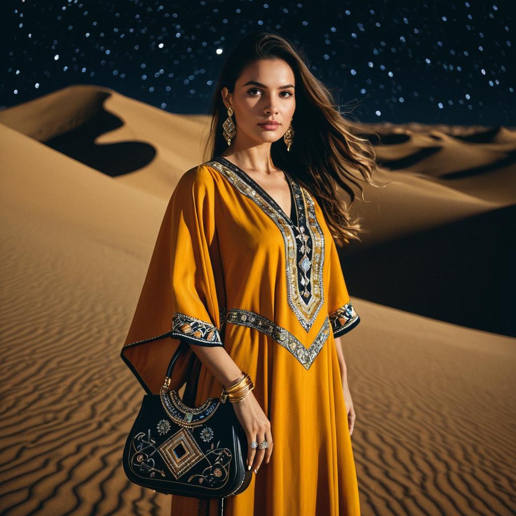 Desert Kingdom. Night. A slim woman with striking golden amber that contrast with her fine face with clear lines and distinctive features. She wears a sparkling diamond ring and earrings with eye-catching gemstones. She wears a custom-tailored embroidered kaftan made from the finest fabrics and carries a high-quality leather handbag in a simple design. Her hair has a natural shine and is so supple that it flows in the wind when she moves. It falls to the middle of her back and is often worn in a simple but elegant style that accentuates her distinctive features.