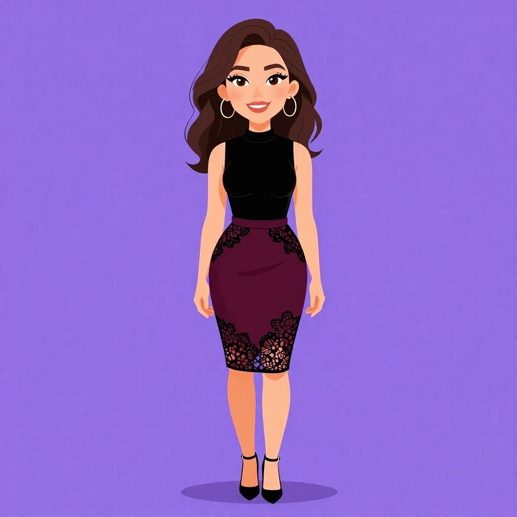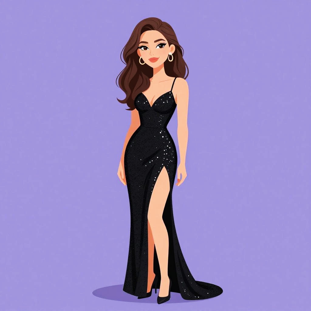 Woman with pretty face and pretty hair. Woman, evening wear, black A-line dress with a fitted bodice, thin spaghetti straps, intricate lace appliqué on the chest, flared knee-length skirt, heeled strappy sandals. --sref 1467