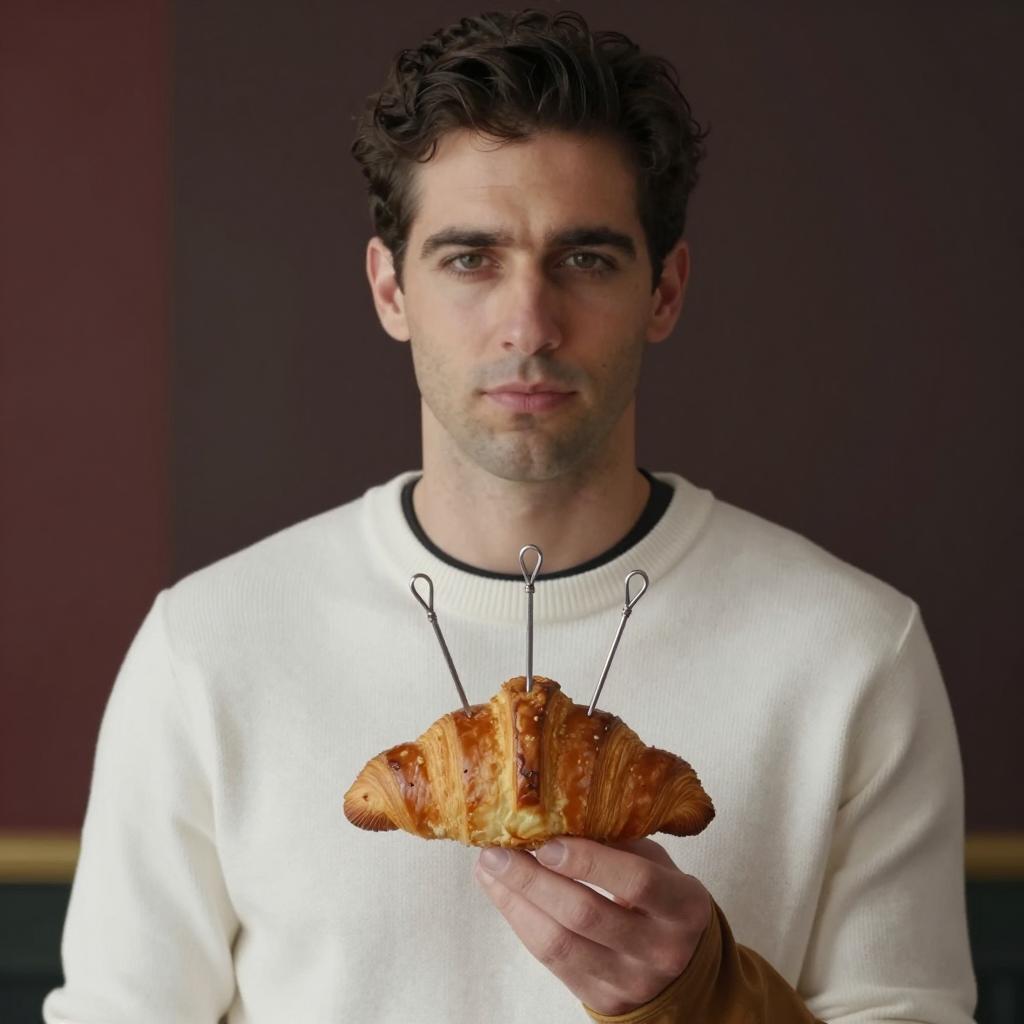 Man with short dark hair, wearing a white sweater over a black shirt, holds a croissant with three metal skewers sticking out of it. The man's expression is neutral. The background is dark, with blurred red and brown shapes. Brown glove on the man's left hand.