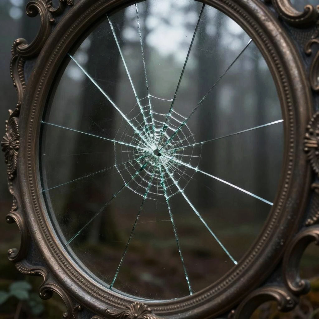 Cracked mirror reflection, antique ornate mirror with spiderweb cracks reflecting a gloomy forest, moody fog and soft light, dark fantasy aesthetic