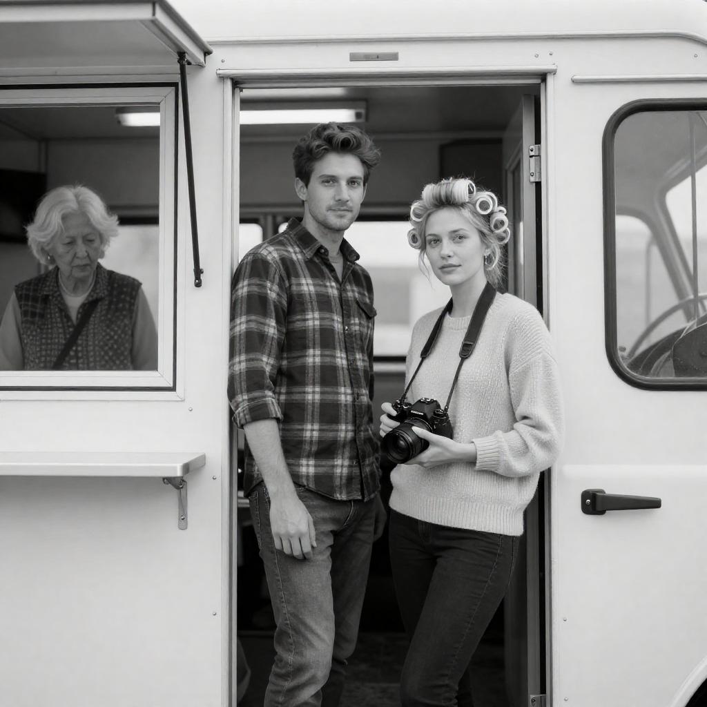 Black-and-white photograph of a man and woman standing in a food truck doorway. Man in plaid shirt, woman in light sweater holding camera. Both look at camera. Woman has blonde hair in curlers. Background includes older woman with white hair. Food truck has metal mesh door and counter.
