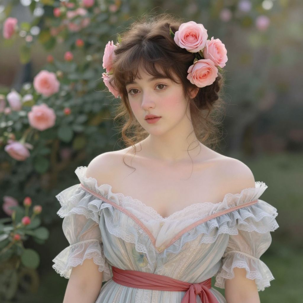 A digital illustration inspired by Impressionist painter Renoir, featuring a woman adorned with delicate pink roses in her hair, wearing a vintage-style off-the-shoulder dress with ruffled sleeves and a red sash, set against a lush floral backdrop with a soft, romantic aesthetic.