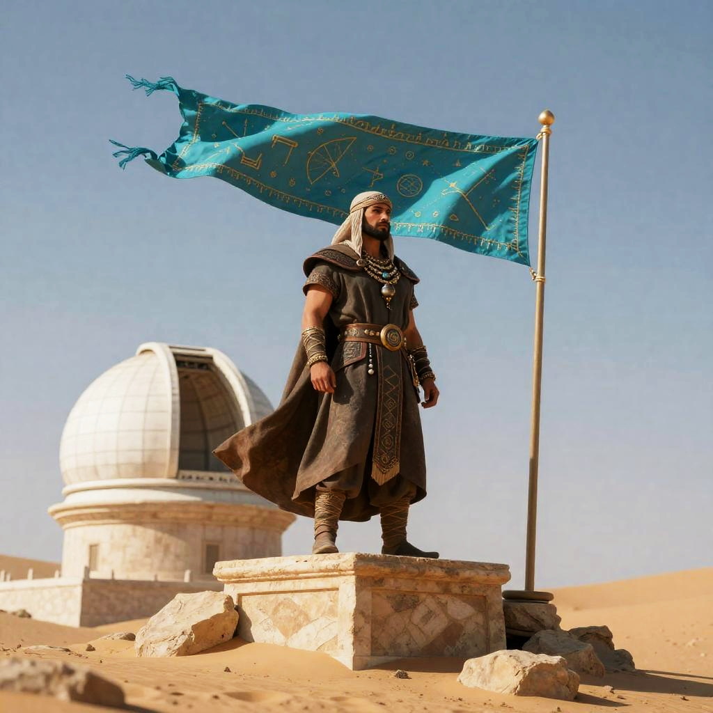 A desert nomad sorcerer stands confidently atop a sun-bleached ruins of an ancient observatory, with a turquoise pennant stitched with celestial runes billowing behind him. This enigmatic figure embodies strength in a dramatic fantasy setting, showcasing intricate details and merging modern digital artistry with classic influences.