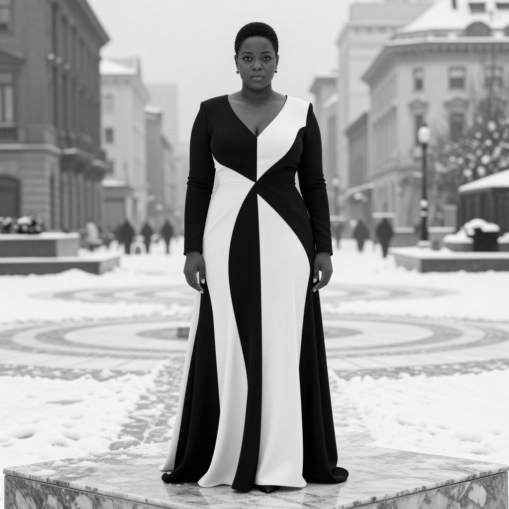 A statuesque black and white fashion muse with elegant, wide-set eyes and a calm, intelligent gaze stands on a marble platform in a snowy urban plaza, wearing a dramatic monochrome gown that blends black and white geometric patterns, the cold winter light capturing the contrast and sophistication of her monochrome elegance.
